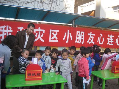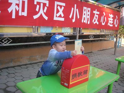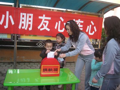 我园开展了“我和灾区小朋友心连心”献爱心捐款活动,此次活动得到了家长、幼儿的积极响应,235名幼儿参加了本次活动,共为灾区小朋友捐款7017元,我园已把这笔倾注爱心的捐款交到天津市妇女儿童发展基金会,希望灾区人民在全国人民的帮助下能够尽快战胜困难,重建家园。